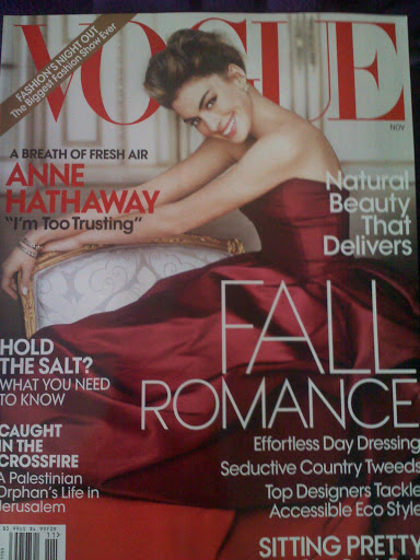 Anne Hathaway is on the cover of November Vogue. She has a beautiful spread shot by Mario Testino. Tonne Goodman is the fashion editor for this spread. Happily Ever After is the title of this feature and anne looks like royalty in each shot.