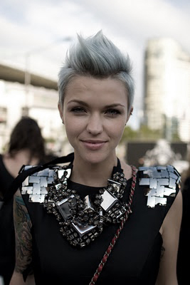 | Kristen McMenamy I have long been a fan of grey. Growing up in Southern NZ, it was all about a dark, moody palette - black, grey, charcoal. Very Bronte sisters on the moors, or a gothic Miss Havisham. Maybe it is something to do with the Scottish heritage. There's something very romantic about grey, which is kind of ironic given it is perceived as a dour, 'lifeless' colour. But I love all the variants of grey. From charcoal to gun-metal, indigo tinged blues to creamy doves. Grey can be moody & urban, like concrete, a stormy sky or steel. Grey can be soft like dove feathers, Weimaraner dogs or smoky coloured cats. Grey can be majestic like dappled grey horses or granite statues. So I have been intrigued by the grey hair trend that hit last year. Kristen McMemany (above on I-D magazine) leads the charge with her striking long grey locks. The silver tone is quite stunning. Men have long been able to go grey and be seen as sexy, suave 'silver foxes' - a la George Clooney, Anderson Cooper, Tim Gunn or Richard Gere. Andy Warhol (below with Debbie Harry) was famous for his trademark grey punk-do. "I thought that young people had more problems that old people, and I hoped I could last until I was older so that I wouldn't have all these problems...So I decided to go gray so nobody would know how old I was and I would look younger to them than how old they thought I was. I would gain a lot by going gray: (1) I would have old problems, which were easier to take than young problems...I could occasionally lapse into eccentricity or senility and no one would think anything of it because of my gray hair...So I dyed my hair gray when I was about twenty-three or twenty-four." The Philosophy of Andy Warhol. Women traditionally had to dye their greys to look 'young and sexy' - until now. Recently I've noticed women, not only older but young girls too, embracing grey hair. It looks hot! My lovely friend Lorna Storm (below) went bleached silver-platinum at age 20. In her heyday as lead singer of Total Magenta she was described by various reviews as Cyndi Lauper's disowned bad little sister and a cross between Nico & Minnie Mouse. It was an amazing look - bright white locks against white skin with darkest brown eyes, & shock of red lippie. (See more on Lorna here.) Kristen McMenamy Kristen McMenamy off-duty |